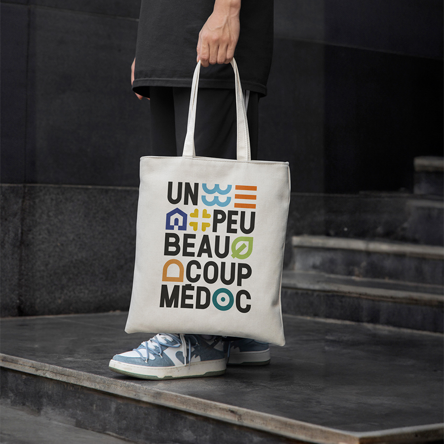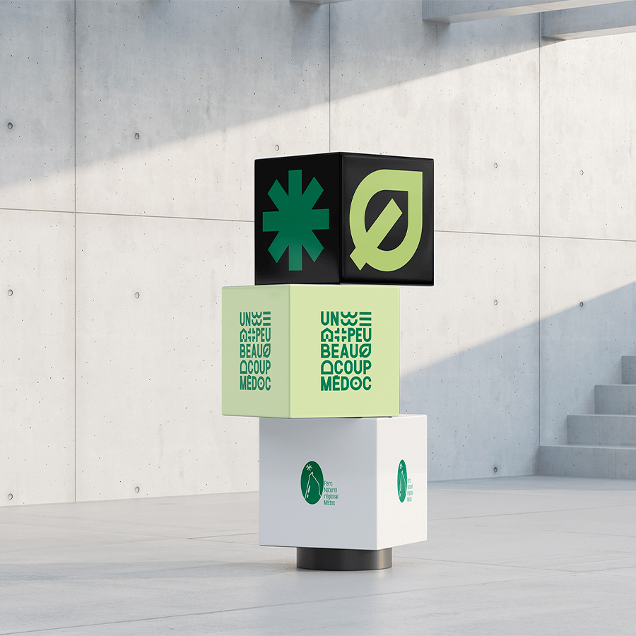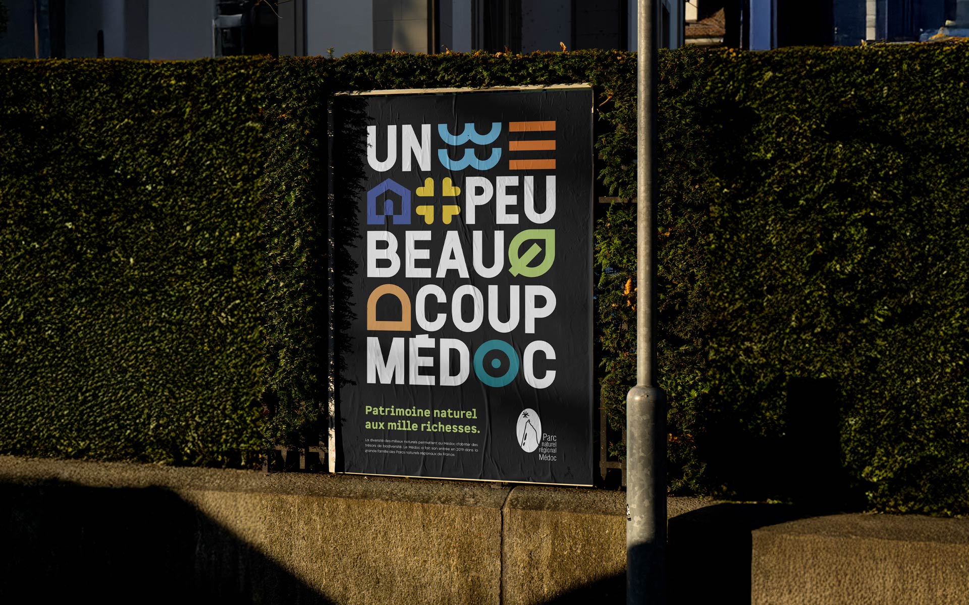 Le logo "UN PEU, BEAUCOUP, MÉDOC" est conçu comme un élément fédérateur, intégrant des pictogrammes illustrant les thématiques phares du Parc (urbanisme, nature, agriculture, tourisme, santé). Ces pictogrammes se retrouvent également dans les déclinaisons visuelles de l’identité.