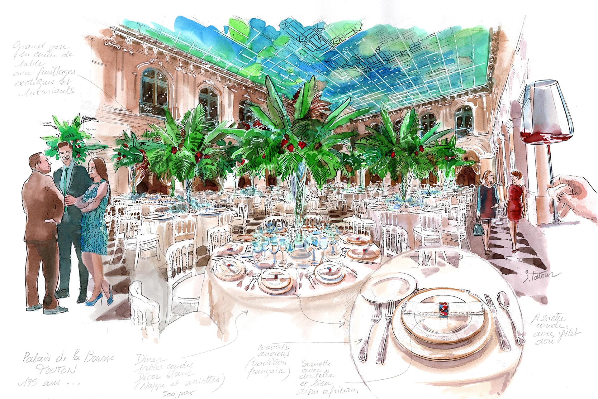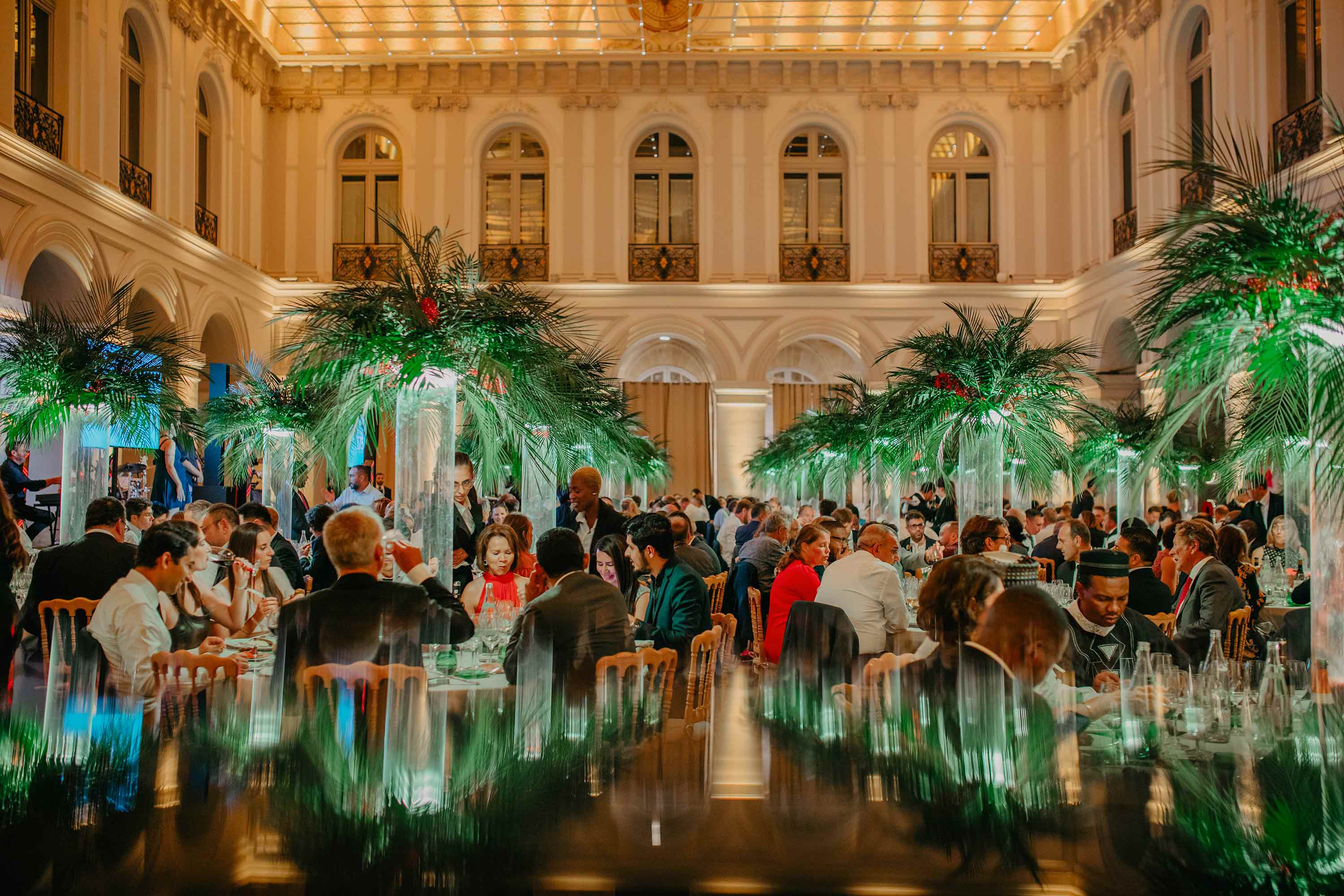 L’espace du dîner a été scénographié comme une Jungle, avec des palmiers en hauteur en centres de table, tandis que les arrivées de vins chorégraphiées en musique rythmaient la soirée.