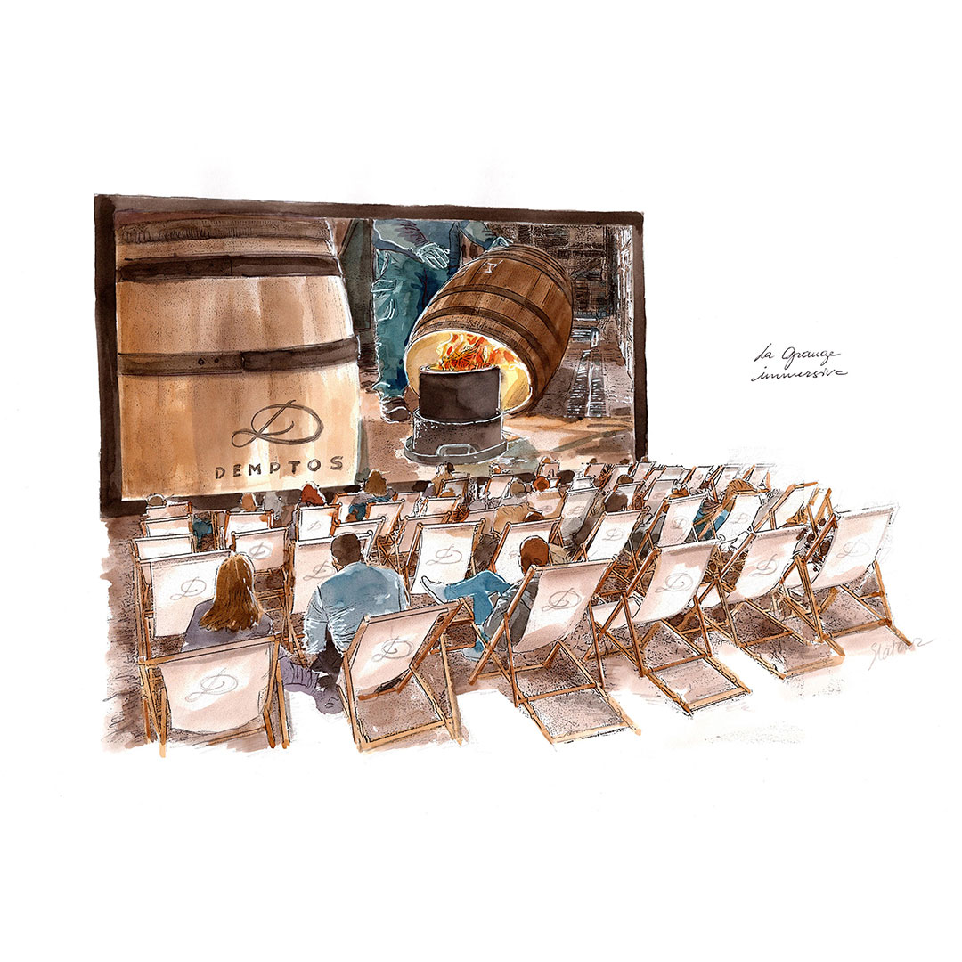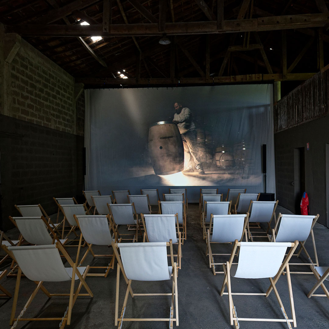Un cinéma géant dans une grange réhabilitée : projection immersive sur écran XXL (8m x 4,5m), bande-son sur-mesure composée à partir des sons de la tonnellerie, visionnage en chiliennes au cœur du site.