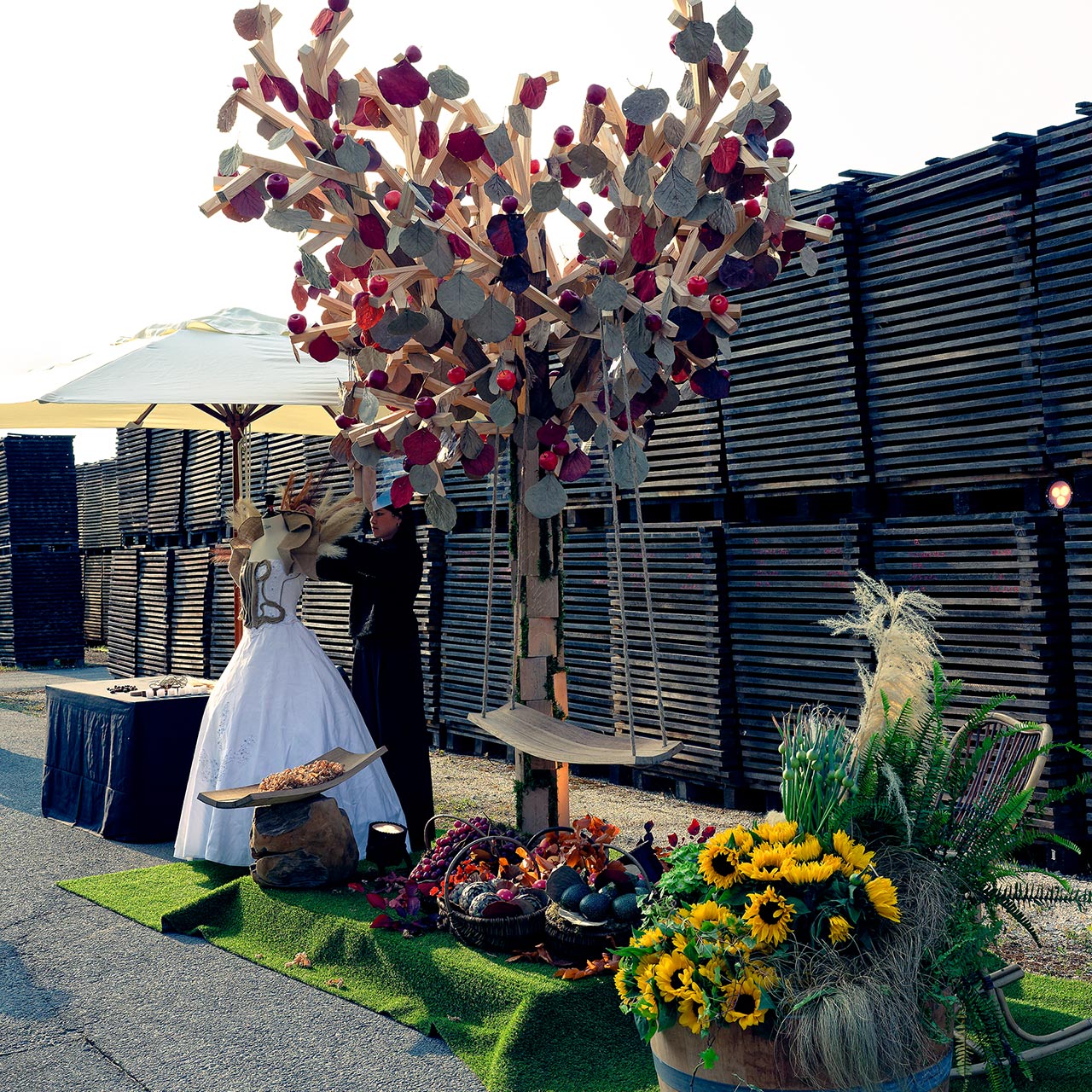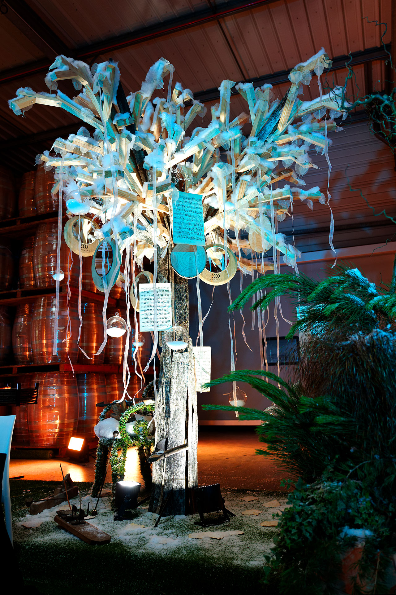 Dans le parc à bois de la tonnellerie, les invités ont traversé quatre espaces scénographiés, composé chacun d'un arbre conçu en douelles de barriques et animé par une performance artistique en live :
