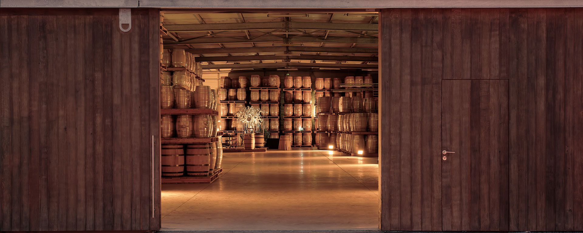 Nous avons ainsi imaginé et conçu un cinéma au cœur de cette grange réhabilitée : une projection immersive sur écran XXL de 8 × 4,5 mètres, accompagnée d’une bande-son sur mesure, issue des bruits de la tonnellerie.