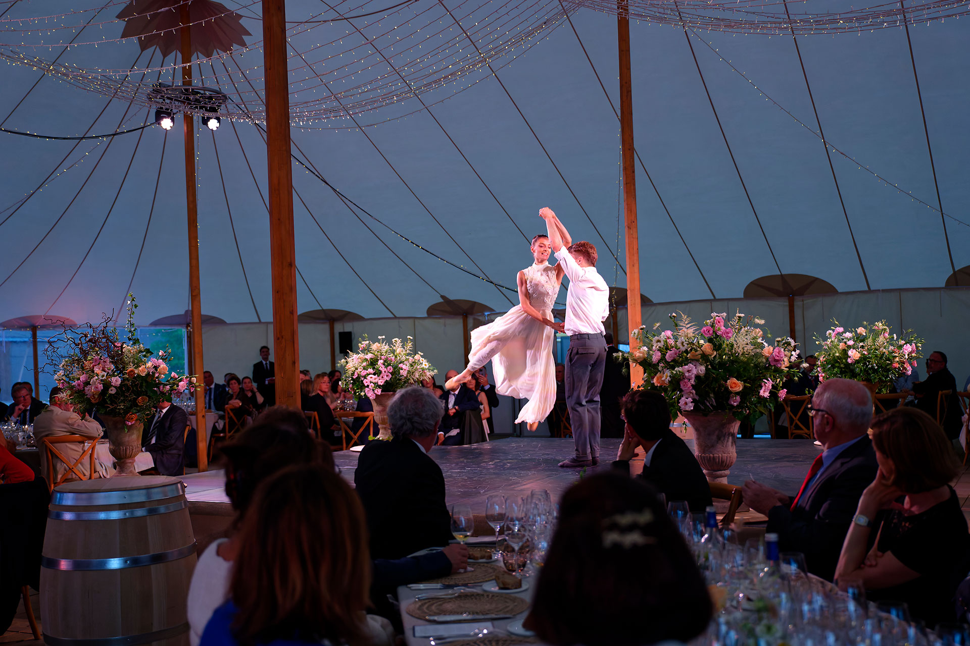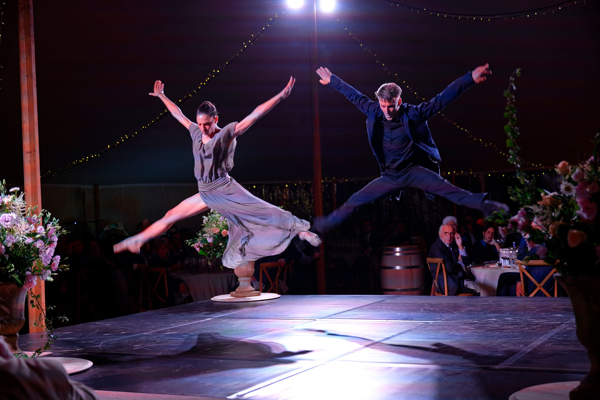 Prestations artistiques : un duo de danseurs classiques et un violoncelliste étaient présents afin de suspendre le temps entre les plats et les arrivées de vin.