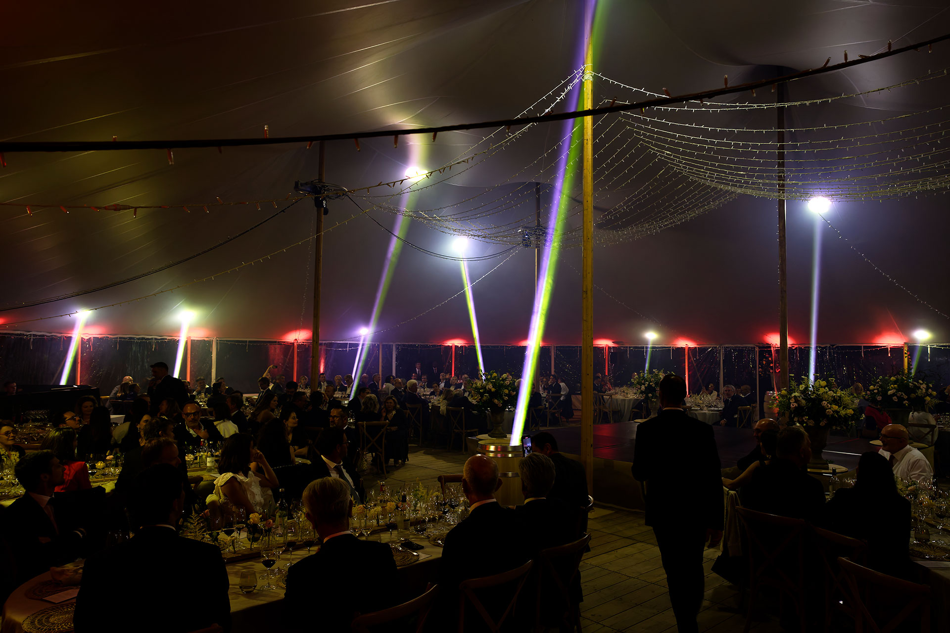 À la fin du dîner, la salle a basculé dans le noir. Une montée musicale puissante a marqué la rupture, avant que les barriques, jusqu’alors décorées de bouquets, ne se transforment soudain en écrins de lumière, révélant un show lumineux inattendu.