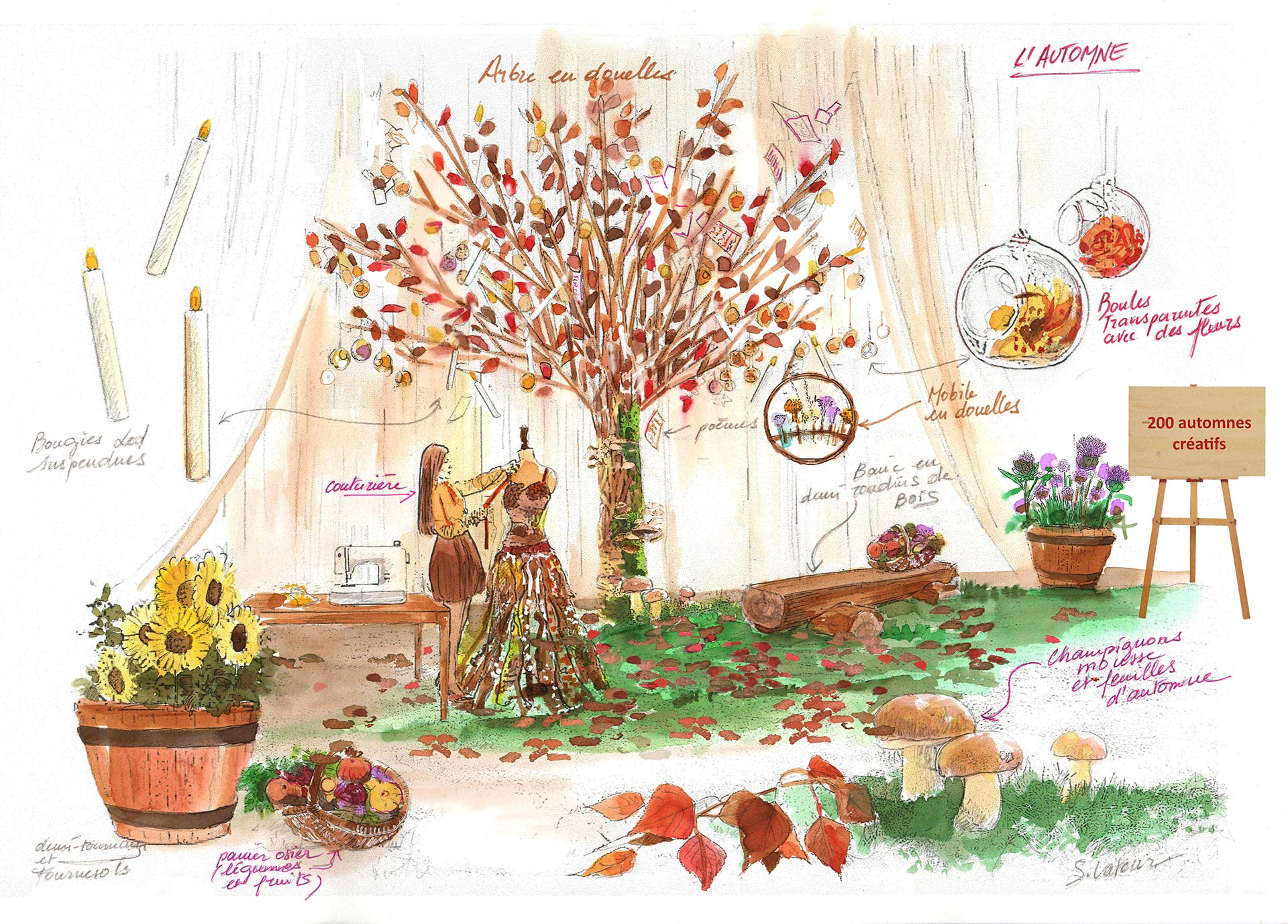 - Automne : confection d’une robe de mariée unique par une couturière, clin d’œil à l’union de la barrique et le vin