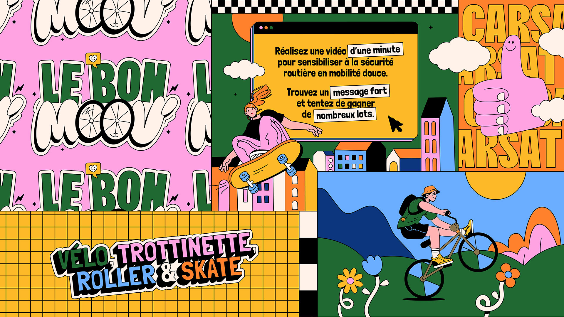 La CARSAT Aquitaine nous a confié la mission d’imaginer une campagne capable de capter l’attention des 15–20 ans, de les mobiliser autour d’un jeu concours vidéo et de diffuser largement un message de prévention sur leurs trajets quotidiens, à l’école comme au travail.