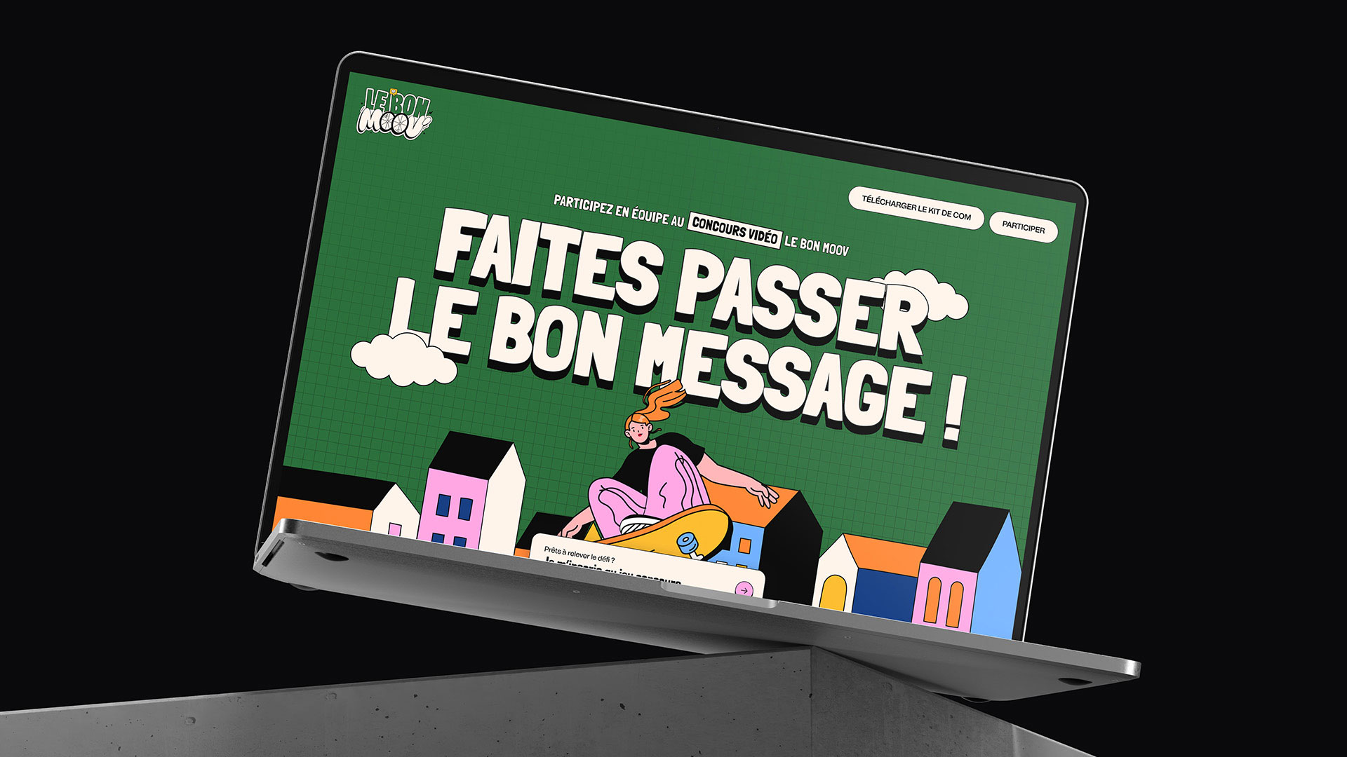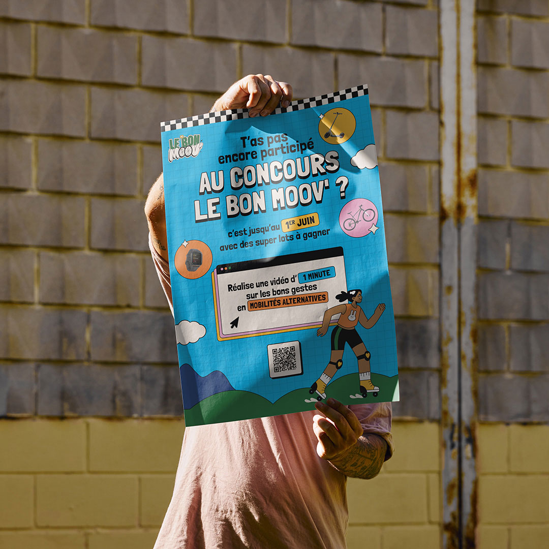 Définition de l’axe stratégique et rédaction d’une recommandation complète, création d’un nom fédérateur — Le Bon Moov’ — avec un appel clair à « montrer le bon mouvement » pour encourager une conduite sécurisée, conception de l’univers graphique et des contenus structurants, mise en place d’une mécanique de concours vidéo au format d’une minute maximum avec quatre catégories de récompenses (meilleure vidéo, meilleur message, vidéo la plus originale et vidéo la plus drôle), ainsi qu’un accompagnement à la rédaction des documents légaux tels que le règlement, le formulaire d’inscription et l’attestation de participation.